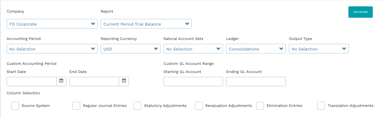 1. Reporting Currency - Select a currency from the reporting currencies available for the company 2. Column selection - Choose a column by checking one of the boxes from the following: Regular Journal Entries, Statutory Adjustments, Revaluation Adjustments, or Elimination Entries